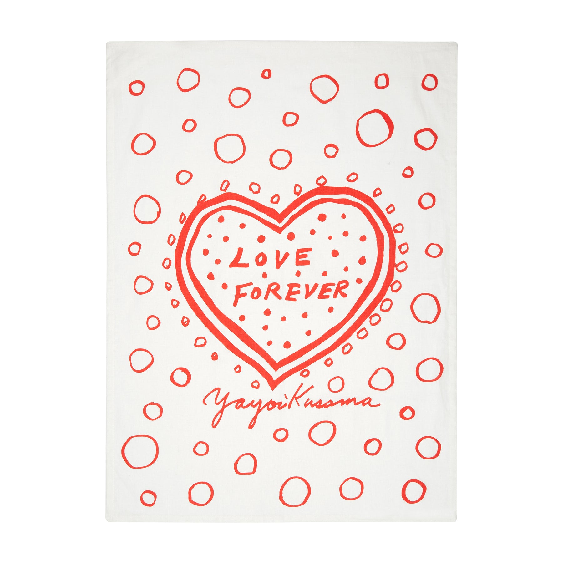 Add a touch of avant-garde flair to your kitchen with the Yayoi Kusama 'Love Forever' Tea Towel Set. Crafted from a premium cotton-linen blend, this set includes two towels, in red and white, both adorned with Kusama's signature polka dots and the affectionate phrase "Love Forever," inspired by her 1998 retrospective exhibition. Measuring 70 x 50 cm, they're both functional and a bold statement piece for any art enthusiast's home.